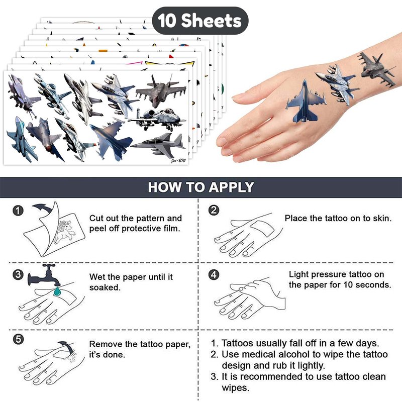 - ✈️UNIQUE DESIGNS: Many children aspire to be skilled pilots.Our JET tattoos provide a selection of exciting fighter JET designs to help your children establish objectives ahead of time, so come on! Plan an amazing birthday party.