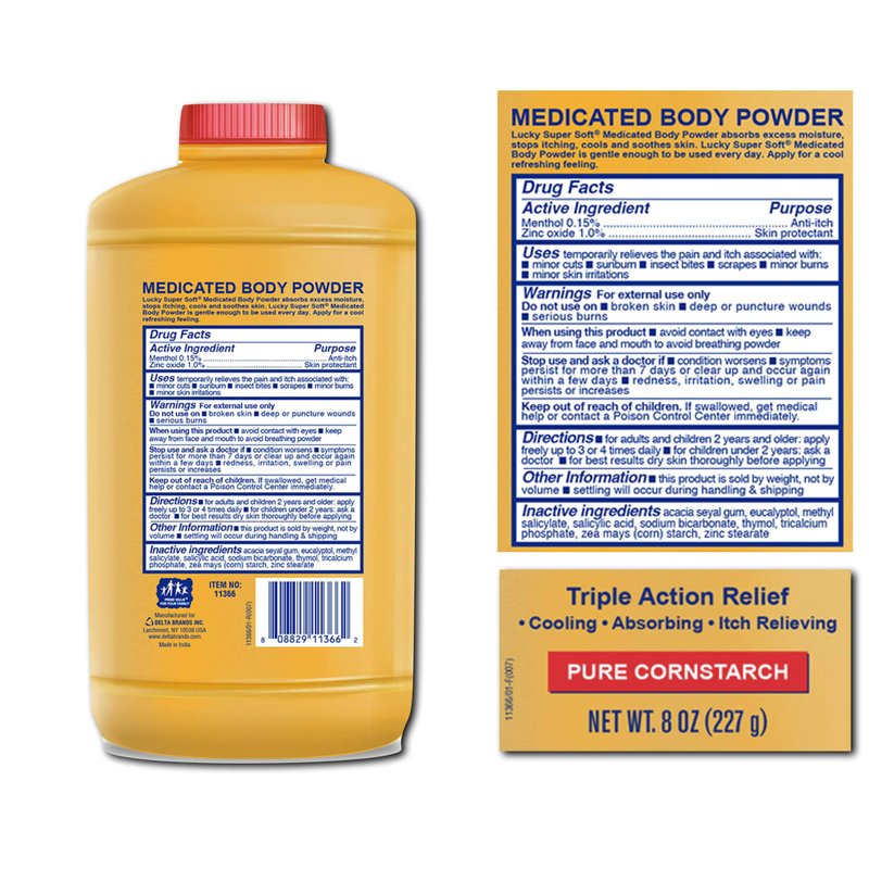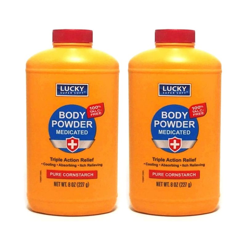 2 pc Body Powder Medicated 8 oz Cooling Itch Triple Action Relief 100 Percent Talc-Free Set of 2 Medicated Body Powder bottles, 8 oz each (227g). Lucky Super Soft absorbs excess moisture. Stops itching, cools and soothes skin. Gentle enough to be used every day. Apply for a cool refreshing feeling. Active ingredients: Menthol 0.15 Percent Purpose: Anti-itch Zinc oxide 1.0 Percent . Purpose: Skin protectant Cornstarch Powered with Zin Oxide and Menthol With cornstarch and zinc oxide, get a protective barrier to repel moisture and help keep skin dry. This gentle powder is recognized as safe and effective by moms and doctors in treating diaper rash, prickly heat, and chafing. Odor neutralizing ingredients to absorb sweat and moisture. Use this Triple Action Body Powder wherever you need a little freshness, comfort, and moisture control. Sweaty and itchy skin needs strong relief. Best of all, this extra-strength cooling and itch relieving powder is gentle enough to use daily when used as directed.