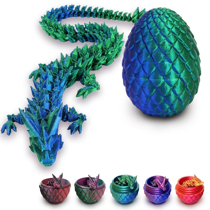 Introducing the 3D Printed Dragon in Egg, a stunning and fully articulated dragon figurine that is sure to impress any dragon enthusiast. This intricately detailed crystal dragon comes with its very own dragon egg, making it a unique and eye-catching addition to any home or office decor. Inspired by popular dragon-themed franchises. This 3D printed dragon eggs with dragon inside captures the imagination of fans of all ages. Whether you're a collector of dragon figurines or dragon decor simply seeking a new desk toy for your office, this articulated dragon will make a fantastic addition to your collection. Our product is guaranteed to stand out among other popular items in the category of desk decor for adults. Ideal as both a decorative piece and stress-relief tool, this fully articulated dragon is the perfect choice for anyone seeking unique and captivating executive desk figurines. Beyond all, this super cool 3D printed Dragon is a perfect gift for your loved ones. Don't miss out on the opportunity to bring some magic into your life with this exquisite 3D Printed Dragon in Egg! Please note that as an item created through 3D printing, minor imperfections may be present. However, rest assured that these imperfections do not compromise the overall quality, durability, or functionality of the dragon. Package includes one articulated crystal dragon and one egg.