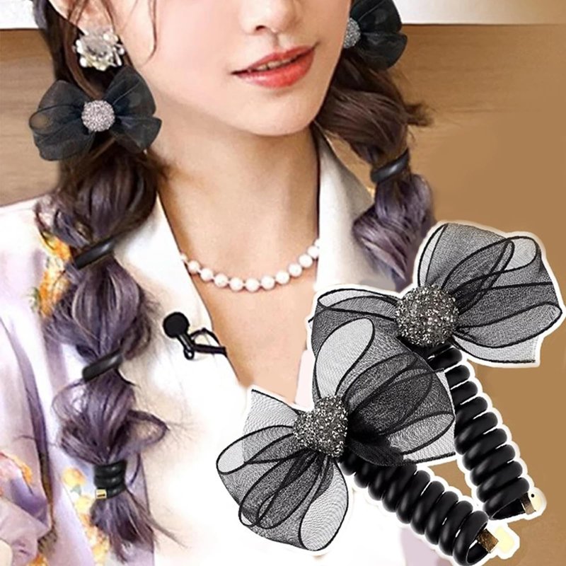 Generic 4Pcs Telephone Wire Hair Bands Bowknot Hair Ties Black Rhinestone Braided Spiral Phone Cord for Women Girls Ponytail Holder Daily Hair Accessories