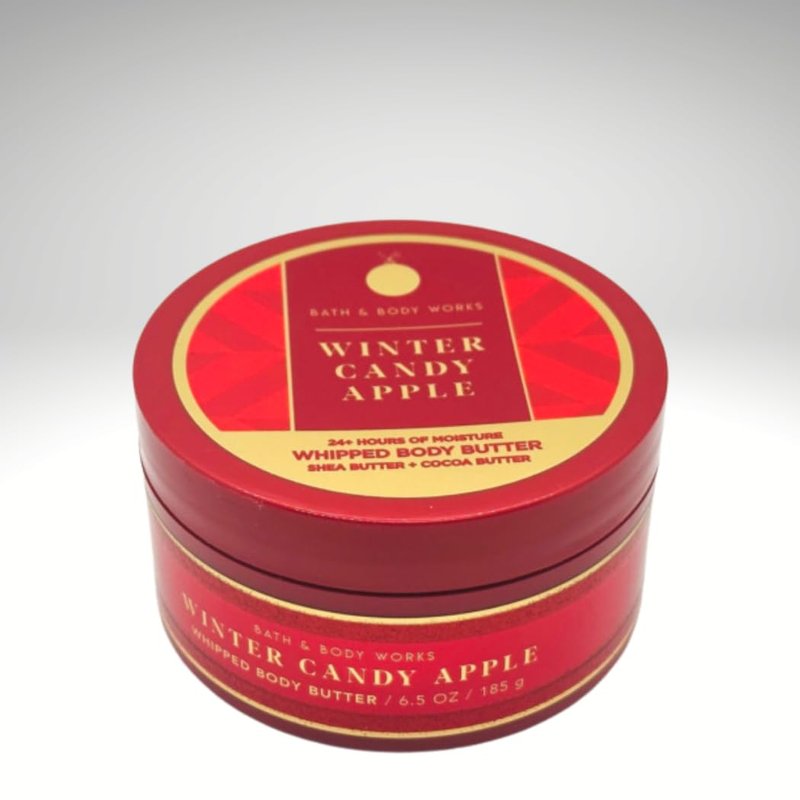 Bath & Body Winter Candy Apple Whipped Body Butter. What it smells like: the super-sweet fruit treat you know and love. Fragrance notes: red apples, winter rose petals, candied oranges, maple leaf, and fresh cinnamon. What it does: provides over 24 hours of intense moisture. Why you'll love it: Infused with the good stuff (shea butter, cocoa butter, and coconut oil). Whipped, fluffy texture absorbs quickly. Made without parabens or artificial dyes. Not tested on animals & Vegan. Dermatologist tested.