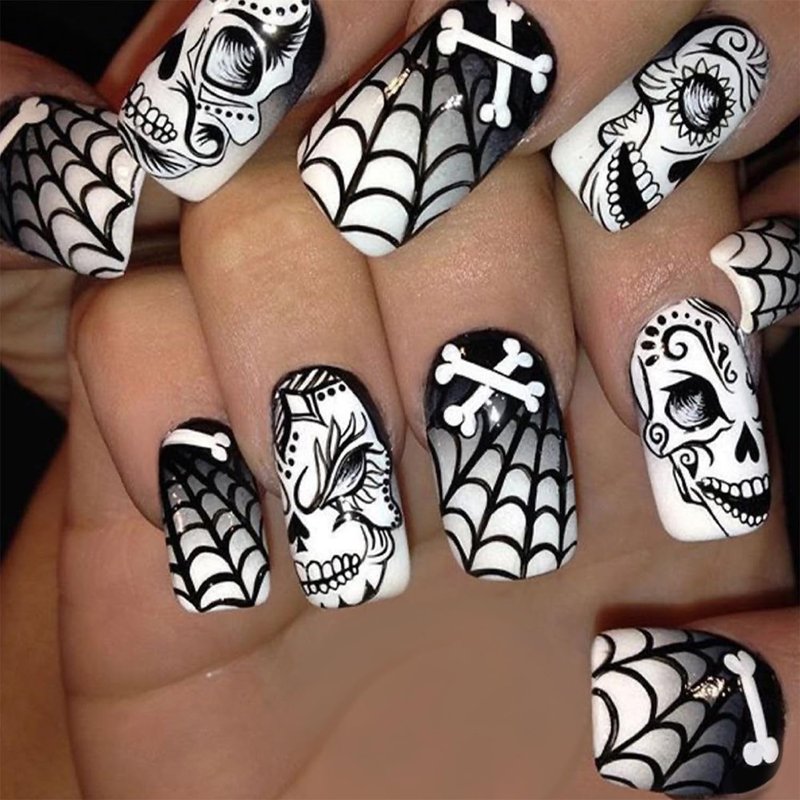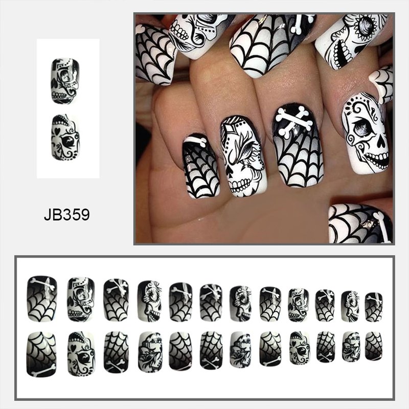 Generic Devil Skull Spider Web Press on Nails Medium Square Halloween False Nails Day of the Dead Acrylic Stick on Nails for Women Girls