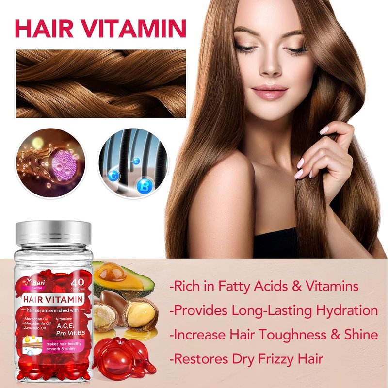 Unlock the secret to luscious, healthy locks with this Hair Vitamin Treatment Oil Capsule from Bari. Enriched with nourishing Moroccan Oil, Macadamia Oil, and Avocado Oil, these no-rinse capsules provide a potent blend of vitamins A, C, E, and Pro Vit. B5 to promote smooth, shiny hair. Simply twist open a capsule and massage the serum directly into your scalp and strands for a rejuvenating boost. With 40 capsules per jar, you can enjoy salon-quality results from the comfort of your home. Suitable for both women and men, this hair serum oil capsule is a must-have for anyone seeking revitalized tresses. Embrace the power of nature's finest oils and vitamins for a hair transformation you'll love.