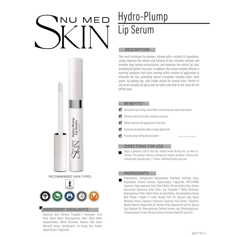 This multi-functional lip plumper base can be used alone or with your faviorite lip color. It will give your lips a lucious plump under your lip color or when worn alone. Our plumper visibly improves the volume and fullness of your lips, instantly hydrates and provides long-lasting moisturization with out over glossing. Enhances the natural lip color providing the perfect rosy pout. In addition, this unique complex delivers a warming sensation that starts working within minutes of application to stimulate the lips, promoting natural circulation, creating fuller, more youth ful-looking lips, with visible results for several hours. Perfect to use as an everyday lip gloss over lip stains and color or use alone for the perfect pout. INGREDIENT HIGHLIGHTS: Hyaluronic Acid, Palmitoyl Tripeptide-1, Butyrosper mum Parkii (Shea) Butter, Butyrospermum Parkii (Shea) Butter Unsaponifiables, Methyl Nicotinate, Brassica Alba Sprout (Mustard) Extract, Amorphophal lus Konjac Root Powder, Caprylic/Capric Triglyceride Ingredients: Polyisobutene, Hydrogenated Polyisobutene, Ethylhexyl Palmitate, Silica, Octyldodecyl Stearoyl Stearate, Caprylic/Capric Triglyceride, PPG-51/SMDI Copolymer, Butyrospermum Parkii (Shea) Butter, Microcrystalline Wax, Sodium Hyaluronate (Hyaluronic Acid), Palmi toyl Tripeptide-1, Methyl Nicotinate, Butyrospermum Parkii (Shea) Butter Unsaponifiables, Amorphophallus Konjac Root Powder, Zingiber O cinale (Ginger) Root Oil, Brassica Alba Sprout (Mustard) Extract, Capsicum Frutescens (Cayenne) Fruit Extract, Tribehenin, Mentha Piperita (Peppermint) Oil, Mentha Viridis (Spearmint) Leaf Oil, Glycine Soja (Soybean) Oil, Phenoxyethanol, Sorbitan Isostea rate, Ethylhexylglycerin, Trihydroxystearin, Flavor, Ricinus Communis (Castor) Seed Oil, Saccharin