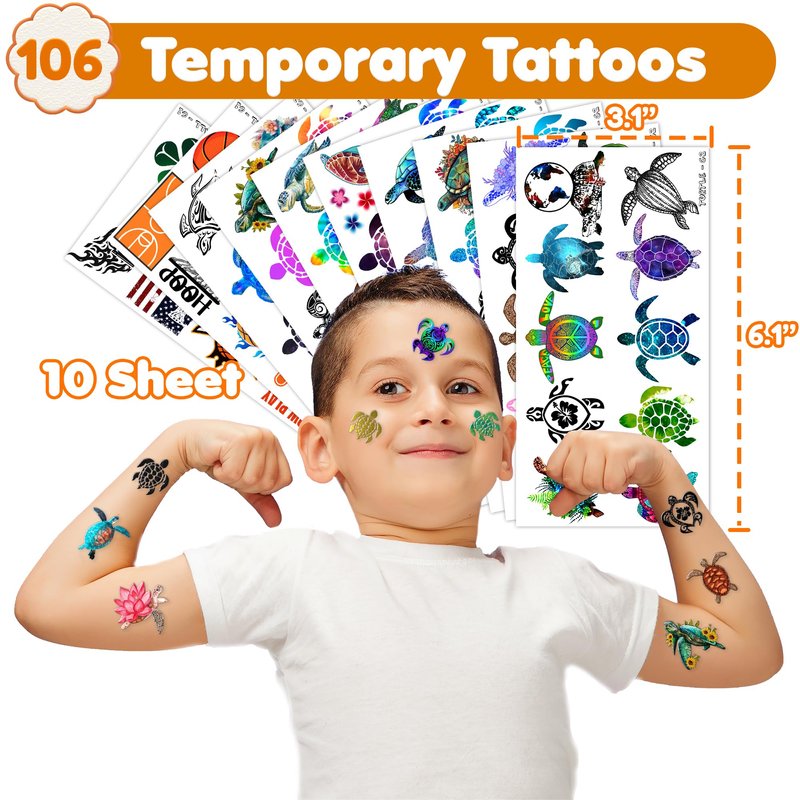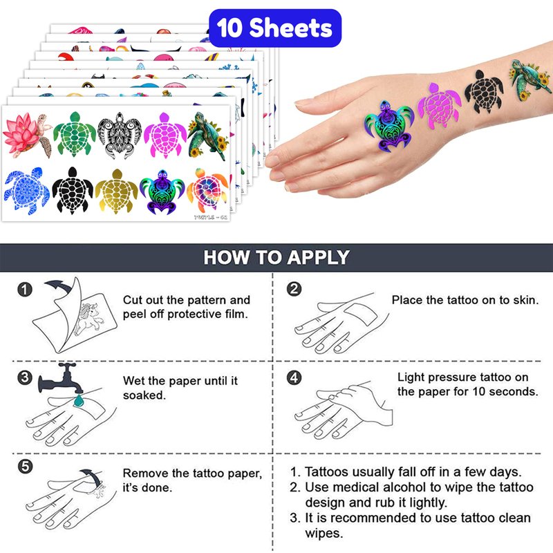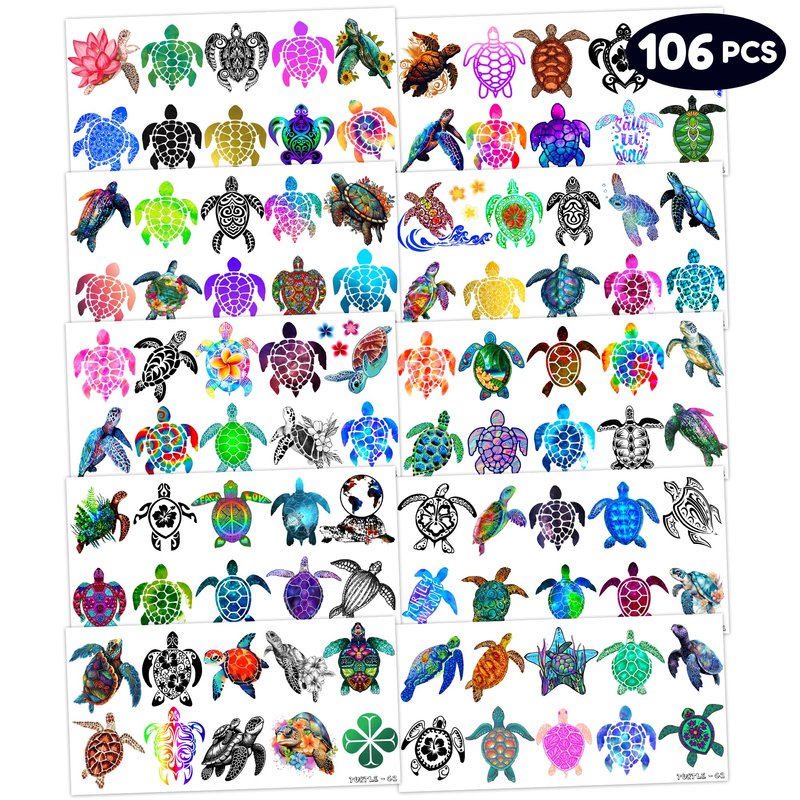 - 🐢【EXQUISITE SEA TURTLE TEMPORARY TATTOOS】: Dive into the mesmerizing world of sea turtles with our collection of temporary tattoos. Featuring 10 sheets adorned with a total of 106 stunning sea turtle designs, this set is a must-have for anyone enchanted by the grace and allure of these marine creatures. Each sheet measures 6.1 * 3.1 inches, offering the perfect canvas for expressing your admiration for sea turtles on clothing, accessories, or as heartfelt gifts for fellow sea turtle enthusiasts.