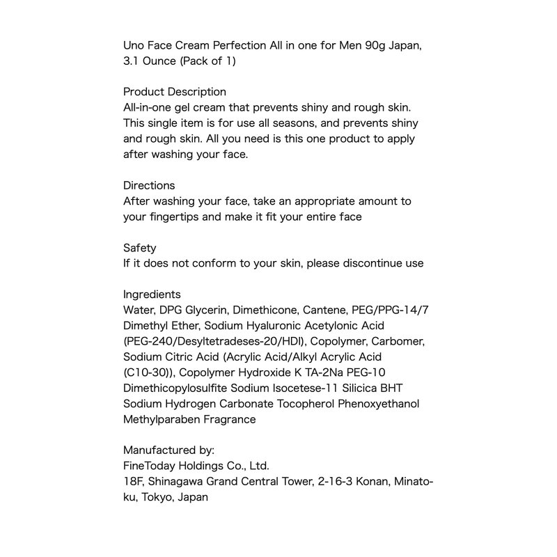 Uno Face Cream Perfection All in one for Men 90g from Japan. Use by taking cream at your fingertips, evenly apply to the whole face. Use day and night after washing face. Ingredients: Water, DPG, glycerin, dimethicone, agartenite, PEG / PPG-14 / 7 dimethyl ether, sodium hyaluronate, sodium acetyl hyaluronate, (PEG-240 / decyltetradeces-20 / HDI) copolymer, carbomer, sodium citrate, (Acrylic acid / alkyl acrylate (C10-30)) copolymer, hydroxylated K, EDTA-2Na, PEG-10 dimethicone, citric acid, sodium pyrosulfite Na, isoceteth-10, silica, BHT, sodium hydrogen carbonate, tocopherol, phenoxyethanol , Methyl paraben, perfume