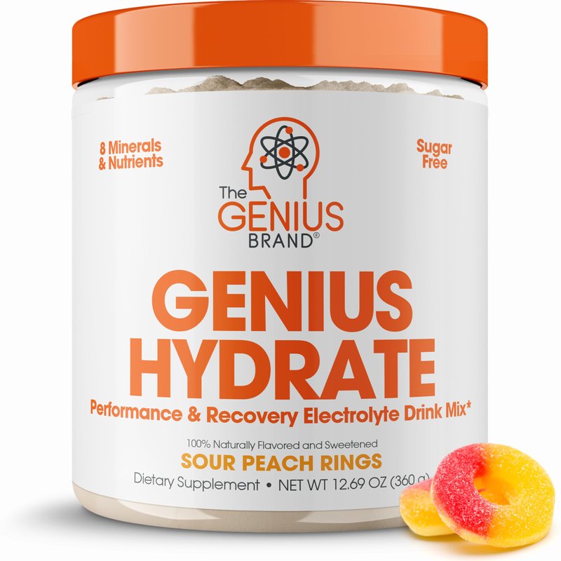 Genius Hydrate Powder Drink Mix Sour Peach Rings 50 Servings Natural Electrolyte Hydration Booster Endurance Supplement with Coconut Water Potassium Magnesium Zinc Sugar Free No Artificial Sweeteners