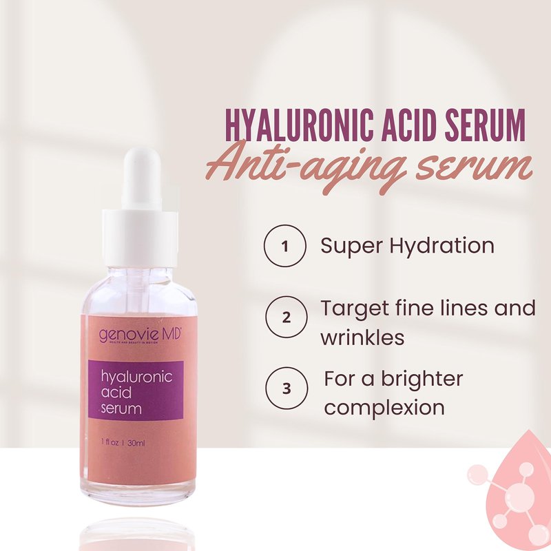 - Hyaluronic Acid Serum - A natural plumping serum suitable for diminishing fine lines and promoting glowing and youthful looking skin. Maintains healthy moisture and smooths out your appearance!