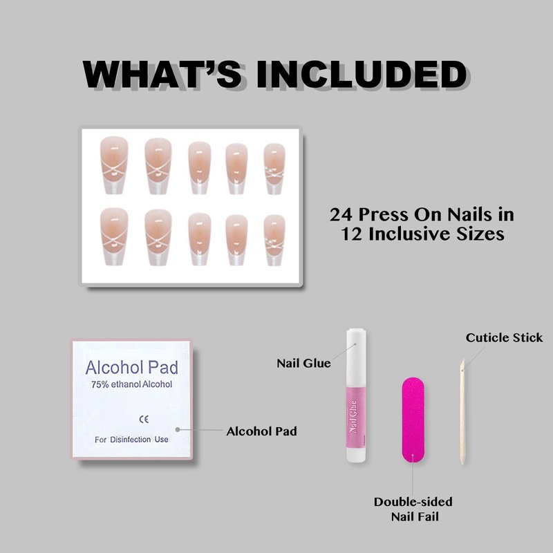 - 【Effortless Elegance】Elevate your style with our high quality press on nails that offers everything you need to achieve a polished and professional-looking manicure at home: 24 Pieces of Press on Nails in 12 Sizes, 1 Nail File, 1 fake nails glue & 1 cuticle stick