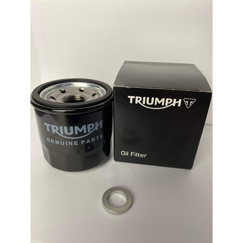 Genuine Triumph Oil Filter and Sump Plug Washer This kit fits most modern Hinkley Triumph Motorcycles Genuine Triumph oil filter and sump washer- T1218001/T3558989 The Spin On Oil Filter fits the following models: America, Bobber, Bobber Black, Bonneville, Bonneville SE, Bonneville T100/900cc, Bonneville T120/Black, Bonneville Speedmaster, Daytona 595, Daytona 955i, Daytona 600, Daytona 650, Daytona 675, Daytona 675R, Rocket III, Scrambler, Scrambler 1200, Speed Four, Speed Twin, Speed Triple from VIN 210445 and up, Speed Triple R, Speedmaster, Sprint GT, Sprint RS, Sprint ST, Street Triple, Street Triple R, Street Triple 765, Street Twin, Street Cup, Street Scrambler, Thruxton, Thruxton 1200, Thruxton R, Tiger 1050, Tiger 885i from VIN 71699 to 124105, Tiger 955i from VIN 124106 and up, Tiger Sport, Tiger 800, Tiger 800 XC, Tiger 1200, Tiger Explorer, Tiger Explorer XC, Tiger Explorer SE, Trophy 1215, Trophy 1215 SE, TT600.