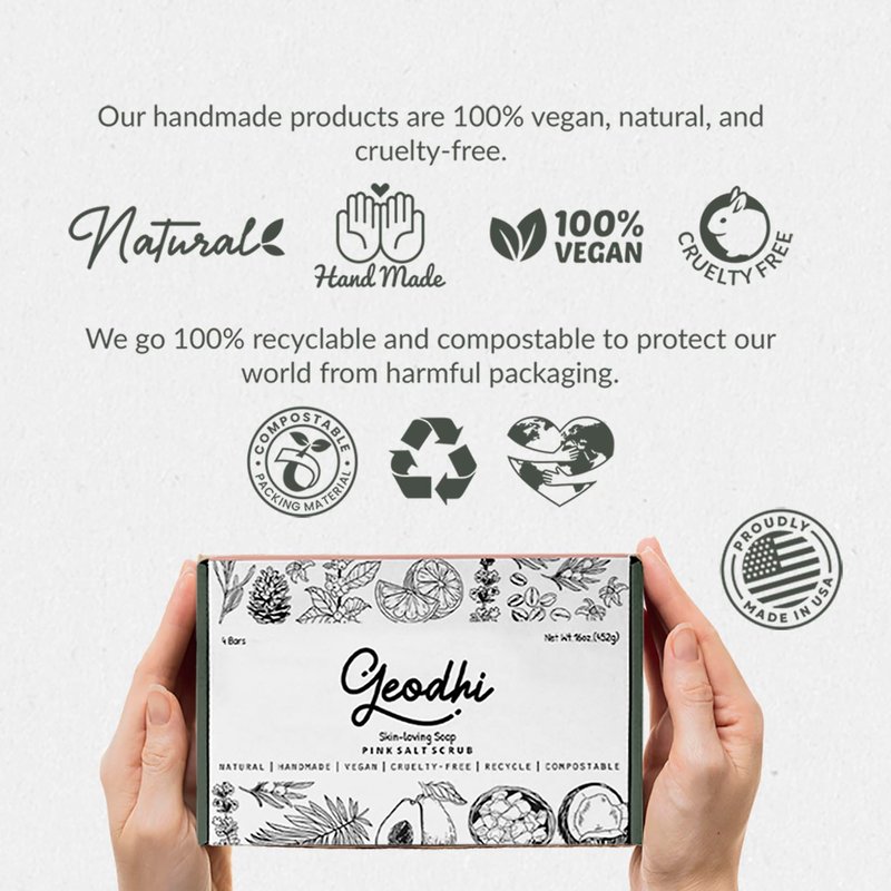 At Geodhi, we take pride in handcrafting each natural hand soap with care and attention to detail. As a result, variations in form, size, shape, color, and weight may occur. Rest assured, despite these delightful nuances, you will always receive a soap that meets or exceeds the specifications outlined in the box. Discover the natural elegance of Geodhi, your new skincare essential designed to deeply nourish, moisturize, and beautify dry skin. Each bar is a testament to the power of nature, meticulously crafted with love and care ensuring is more than just a cleansing bar; It’s a holistic skincare solution. Each ingredient is chosen for its beneficial properties, with no harsh chemicals, parabens, or synthetic fragrances, making it ideal for sensitive and dry skin types. Our soap’s gentle, effective formula works to cleanse, hydrate, and rejuvenate, leaving your skin feeling refreshed and radiant. Our body soap bars are Ideal to use as travel soap, face soap, bath soap, and shower soap.