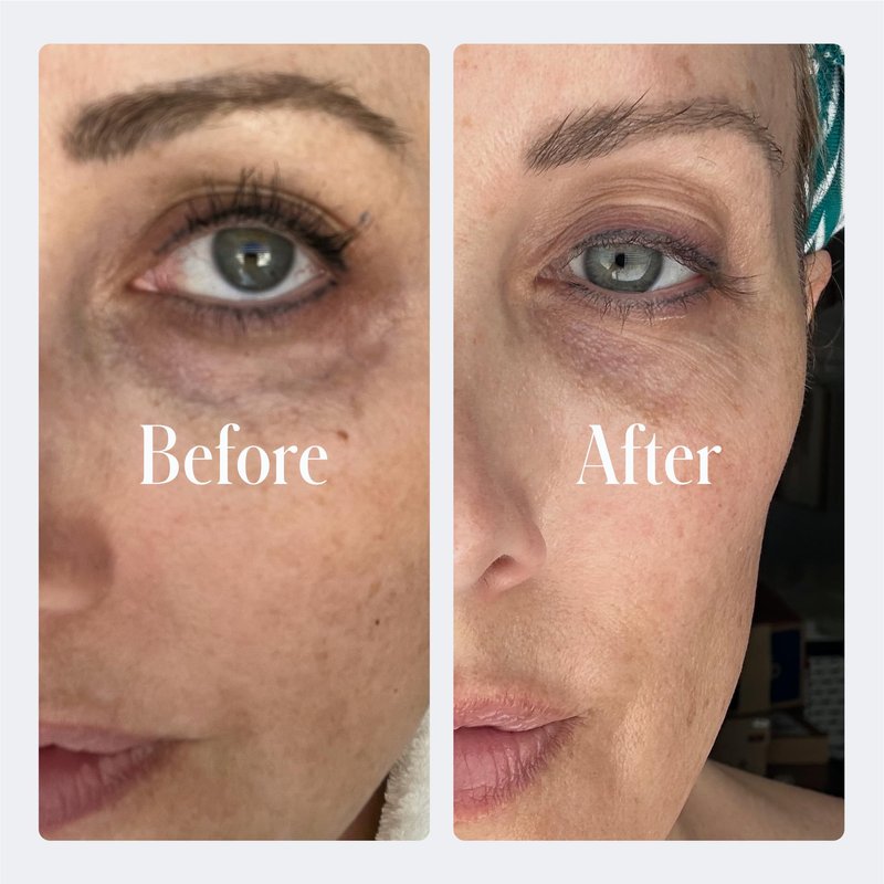 Geologie's Dark Circle Eye Cream formula contains natural skin lightening ingredients kojic acid and caffeine to reduce the appearance of dark circles, puffiness, and fine lines. The dermatologist-designed eye cream is designed to banishe melanin to brighten dark circles, quickly reduce redness and puffiness and gently targets hyperpigmentation. Kojic acid brightens and evens out skin tone under the eyes by inhibiting melanin production. Caffeine reduces puffiness and redness + tightens and brightens skin. Niacinamide + Hyaluronic Acid provide added hydrating and smoothing benefits. This fast-absorbing, lightweight formula won't leave any greasy residue. A little goes a long way! Before bed, lightly dab one pump eye cream onto the soft skin under both eyes as part of your evening skincare routine. Dermatologist Tested. Vegan. Cruelty Free. Fragrance Free. Our full-size eye cream should last about 3 months. Shop our Dark Circle Eye Cream and say bye bye dark circles + bags, hello to refreshed, revitalized, and youthful-looking eyes.