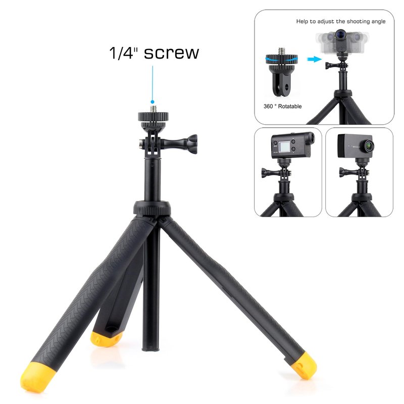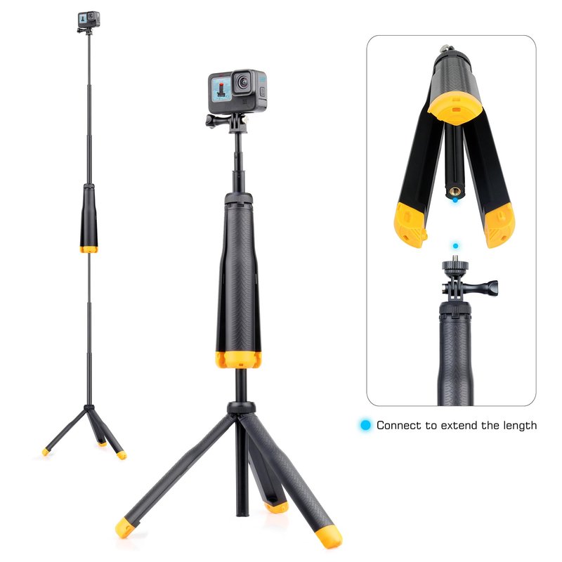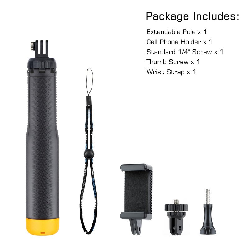 - Floating action camera in the water - It can be used as a extendable floating pole or a telescopic floating tripod in the water. You can capture underwater movements without holding the grip. The high visibility yellow cap piece is easy to spot and retrieve in the water.