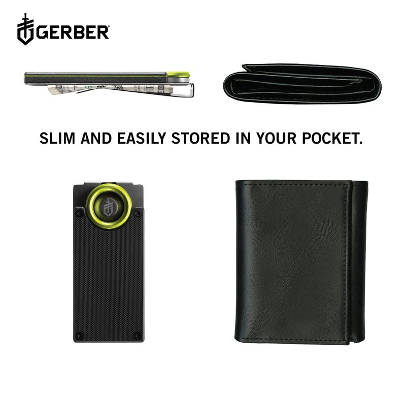 - MONEY CLIP AND GERBER KNIFE: Features discreet 1.75" steel blade, space for up to five credit cards, titanium coated steel body, G-10 front plate, large engravable surface, finger slot with serrated thumb rest, and anodized aluminum accents