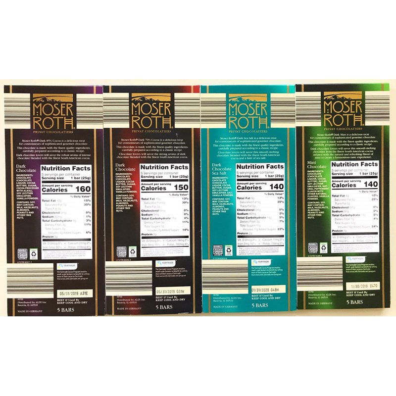 German Dark Chocolate Bundle of 4 Varieties. Moser Roth 85% Cocoa, 70% Cocoa, Dark Sea Salt and Dark Mint. Low Sugar Gourmet Candy Bars. Good for the Waist Line and Chocolate Lovers. From Germany!