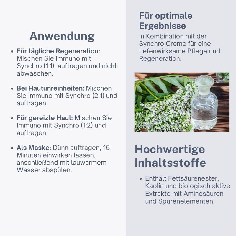 Treats signs of aging, acne, stretch marks. For aging and stretch marks mix equal parts with SYNCHRO. For acne mix 1 part SYNCHRO 2 parts IMMUNO. Allow to penetrate.Do not wash off. Can be used as a mask on acne spots. Leave to dry overnight and wash off in the morning.