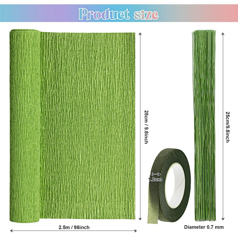 - Large Quantity: you will get 6 rolls of crepe paper rolls in 6 different colors, each roll is 10 inch x 8 feet, and 50 pieces of 9.84 inch long No. 22 green floral iron wires, 1 roll of 0.5 inch green tape, these wrapping paper rolls are enough to meet your various decoration needs