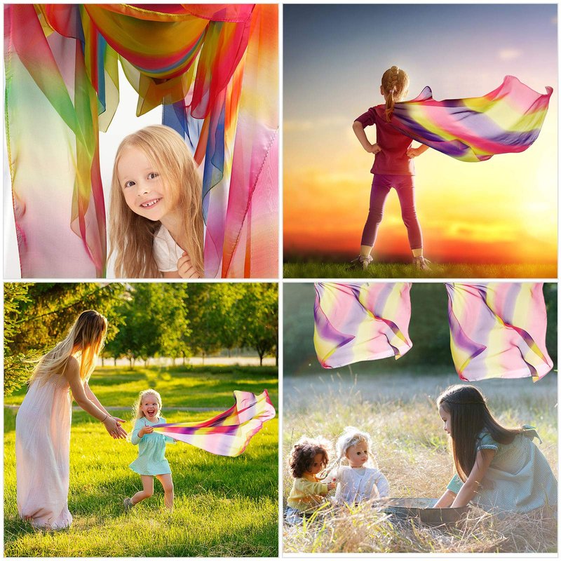 - Creative and fun: 3 style silk rainbow scarfs are suitable for playing dress up, doll blankets, dancing and twirling, capes, preschool activities and songs, Halloween costumes, picnics, traveling, movement, juggling, and more