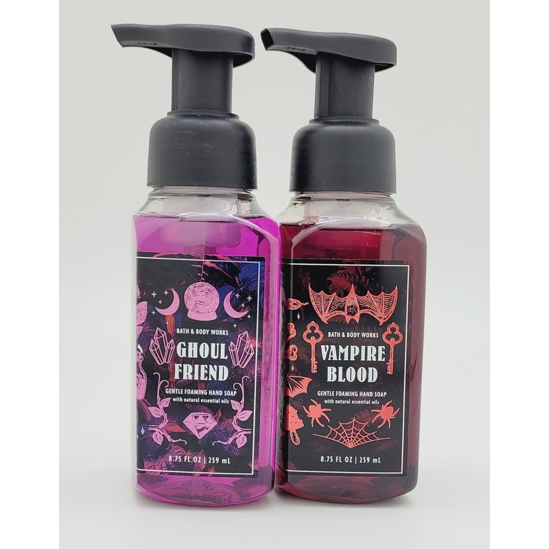 Bath and Body Works (Packaging May Vary) 2-pack Gentle Foaming Hand Soap-Vampire Blood and Ghoul Friend. 17.5 Oz./8.75 Oz. each bottle. Ghoul Friend scent-dark strawberries, peony, and citrus. Vampire Blood scent- red berries, night-blooming jasmine and petrifying plum. Ingredients include: Natural essential oils, vitamin E, shea extract and aloe