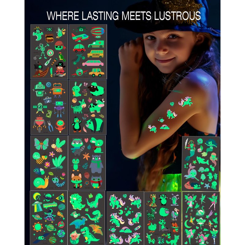 - TEMPORARY TATTOOS FOR KIDS: Delight your children with our Luminous mixed styles temporary tattoos, perfectly designed for their imaginative play and party excitement.