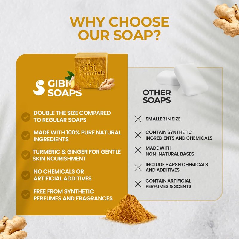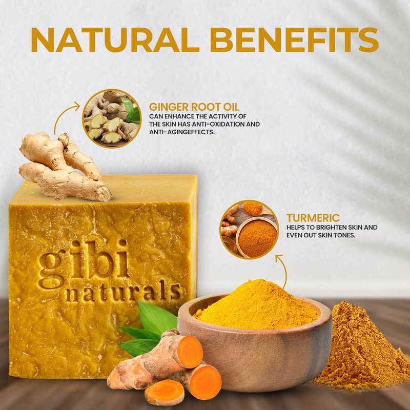 - ππππππ πππππππππ π ππππππ: Gibiβs ginger & turmeric soap bar offers a gentle yet effective cleanse for all skin types. Turmeric ginger soap bar maintains a fresh look, making it ideal for daily use on both face and body.