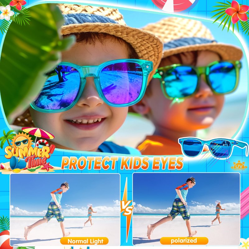 - 【UV 400 Eye Protection & Polarized Lens】 UV 400 protected lenses with added polarization for eliminating glare which can lighten the fatigue state of your kid’s eyes, at the same time, kids sunglasses can maintain clear vision and natural color. Perfect for the summer beach pool party and all the outdoor activities. And also our lenses are very colorful, the color of the lens is matched with the translucent frame will make kids the center of the party or anywhere!