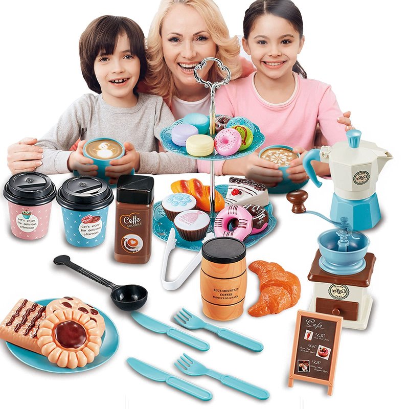 - Kids Tea Party Set: 41 PCS Tea Party Set include Coffee Maker Set: coffee barrel x 1, coffee pot x 1, Ice cream x 3, coffee grinder x 1, coffee cups x 2, paper coffee cups x 2, coffee jar x 1, spoon x 1 , dishes x 3, food tong x 1, decoration board x 1, gift box x 1 , Play Food Dessert Set include knives x 2, forks x 2, 2-tier cake stand x 1, desserts x 17. Great for pretend and role play, create hours of fun playtime for kids.