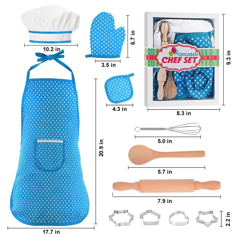 - THE KIDS CHEF SET INCLUDES: Passed CPSIA and ASTM standard tests, this kids apron set include Chef's hat, Apron, Oven mitt, Hot pad, Wooden spoon, Hand mixer, Rolling pin and 4 cookie cutters. These gorgeous little chef starter kit meet cooking and baking needs of the preschool girl & boy baking game.Kids with their own baking tools would be more confident and receptive to career consciousness cultivation