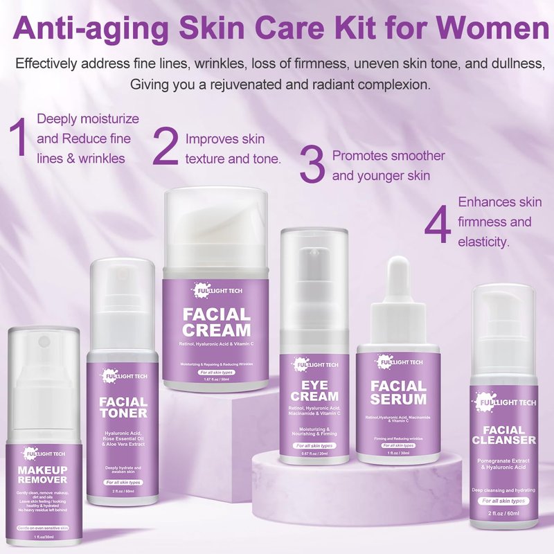 - Anti Aging Skin Care Sets for Women: Our comprehensive set includes Women's Facial Cleanser 60ml,Facial Toner 60ml,Facial Serum 30ml,Facial Cream 50ml and Eye Cream 20ml ,providing a complete skin care routine for anti-aging needs.Beautiful packaging and pratical use makes it a great women gift ideas.Top birthday gifts for women,gifts for wife,gifts for girlfriend,gift for her,gifts for moms.Take care of their skin and maintain a youthful appearance.