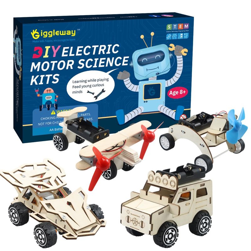 Fun & Hands-on Kids Science Kits Explore electricity circuit robot kit by assembling Giggleway electric motor robot kits. Help to develop their hand-eye coordination, fine motor skills, problem-solving skills and sense of imagination and creativity. Kids Science Experiment Kits for Kids 8-12 kids Create engineering building kits with their own hands, using the wood, motors, wires and all parts included. Engineering toys for kids and Family, Learn Simple Principles Create electronic kits with the motors, wires and all parts included. Learn basic principles of simple circuit, motors, mechanical and engineering, robotics. Make learning more fun, stimulate their curiosity and creativity. Safe Kids Building Sets Safe and non-toxic stem kids building kits for kids age 8-12 Learning Through Playing STEM Kits Get a head start with STEM educational toys and lay the groundwork for lifelong creative learning skills. Our kids experiment kits encourage kids to master big concepts while having fun! Beautiful Color Instructions Unlike most science kits, the Giggleway kit features a full color instruction manual with detailed and engaging illustrations. Each page is broken down into simple steps to complete kit. Great Gift Idea! Eye-catching Packaging includes 4 wooden building learning kits. Perfect toys for 8 9 10 11 13 year old boys girls.