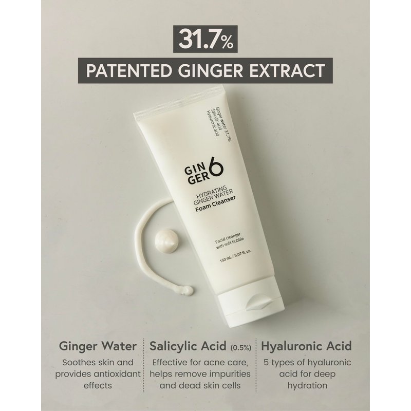 Ginger 6 Hydrating Foam Cleanser (150ml) Transform your skincare routine with the Ginger 6 Hydrating Foam Cleanser, specially designed for acne-prone skin. With 31.7% ginger water extract and 0.5% salicylic acid, it deeply cleanses, removes impurities, and targets blemishes without over-drying. The unique micro-bubble formula refreshes your skin, while hyaluronic acid provides intense hydration, leaving it soft and plump. Enriched with 11 natural extracts, this gentle cleanser calms redness and irritation, promoting a balanced complexion.