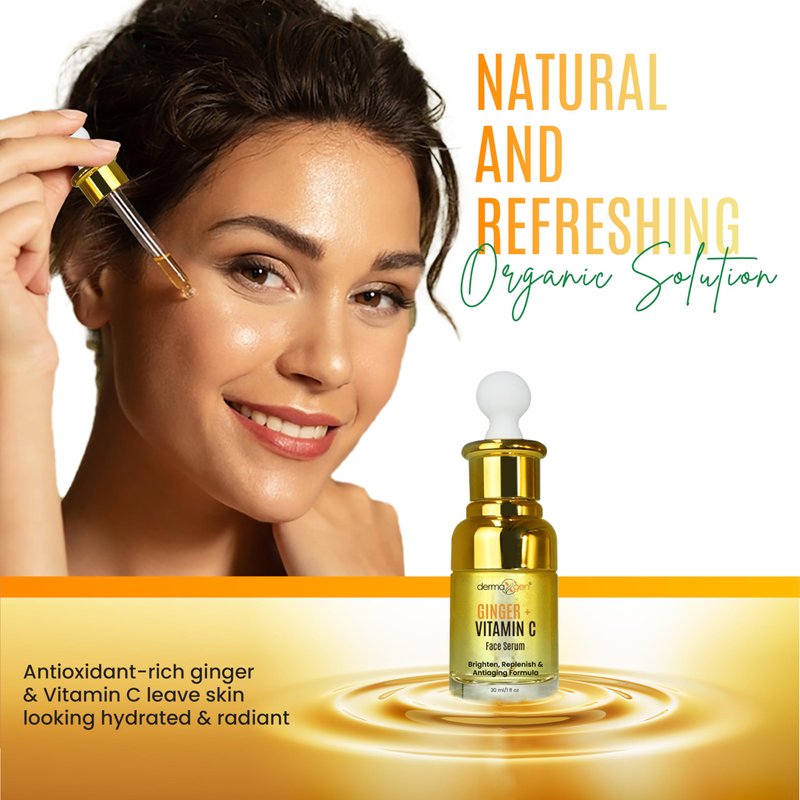Introducing our Ginger Face Serum + Vitamin C + Turmeric, the ultimate organic acne treatment and skin rejuvenator. This powerful serum is designed to give you clear, hydrated, and youthful-looking skin. Harnessing the age-old benefits of ginger and turmeric, this serum is packed with natural antioxidants that provide a radiant glow to your complexion. Turmeric, known for its healing properties, works wonders in reviving and boosting your skin's natural radiance. It also helps protect against aging, reduce fine lines and wrinkles, and restore elasticity, giving you a more youthful appearance. With the addition of vitamin C, this serum becomes a perfect repair and moisturizer for your skin. The combination of nourishing vitamins, turmeric, and other rejuvenating organic ingredients replenishes and recharges your skin from within. Aloe vera extract, sodium hyaluronate, Centella Asiatica extract, and sophora Angustifolia extract work together to deeply moisturize and repair your skin, leaving it hydrated, supple, and refreshed. Our Ginger Face Serum + Vitamin C + Turmeric is a potent solution for various skin-related conditions. Its antioxidant-rich formula protects your skin against damage, restores its surface, and minimizes the appearance of wrinkles, dark spots, and dullness. With regular use, you can enjoy improved skin texture, increased elasticity, and a youthful complexion that radiates vitality. This unique blend of ginger, turmeric, and vitamin C offers multiple benefits. It minimizes expression lines, age spots, sagging skin, and collagen loss, effectively controlling the premature aging process. Within just two weeks of daily use, you will notice deeply hydrated and moisturized skin, while the long-term effects reveal a younger, supple complexion. Indulge your skin in the power of natural ingredients with our Ginger Face Serum + Vitamin C + Turmeric.
