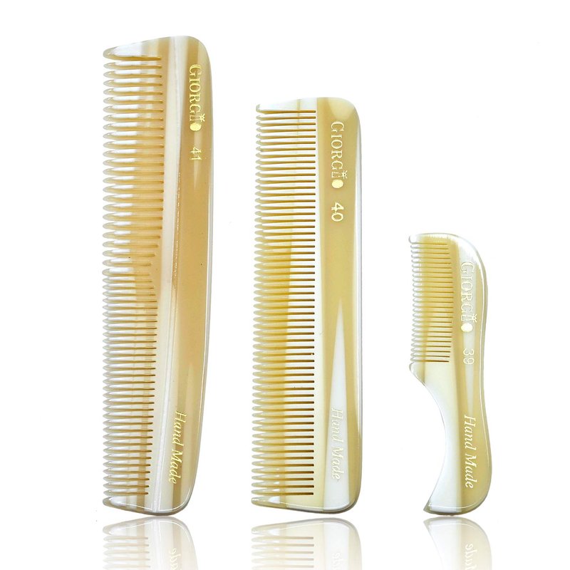 Giorgio G39 2 3/4" 73mm 1.0 ounce, Hand-Made X-Small man pocket comb imitation horn fine toothed comb for beard and moustache. Extra small men’s pocket comb, for a quick touch-up for mustache & beard. Perfect for travel, great for the car or office. Giorgio G27 4 1/2" Tokyo Hand-Made Flexible Fine Tooth Comb. Giorgio G41 5" 130mm Coarse / Fine teeth, Flexible men's Hair, Beard & Mustache Pocket Comb. Hand-Made of quality Durable Cellulose , Saw-cut and Hand Polished. (Horn). You will find it easier to untangle any knots and style the beard properly. Use the beard & mustache comb while blow drying to style your beard and keeps its shape. Made of cellulose a non-petroleum base material, that’s why they have minimal static, saw-cut by special circular saws and hand polished for ultimate and effortless glide, preventing pulling and hair breakage.Smooth, rounded teeth for sensitive skin stimulating the hair cuticle’s and release of hair's natural oils for a hair strong and healthy. Anti-static. The perfect man gift. Fits in your pants pocket, shirt's pocket or bag, you can groom your facial hair anytime, anywhere. Easier to clean than wood. Unlike beard brushes, combs for beard and moustache are best used on damp hair. Ease to clean with shampoo under the tap.