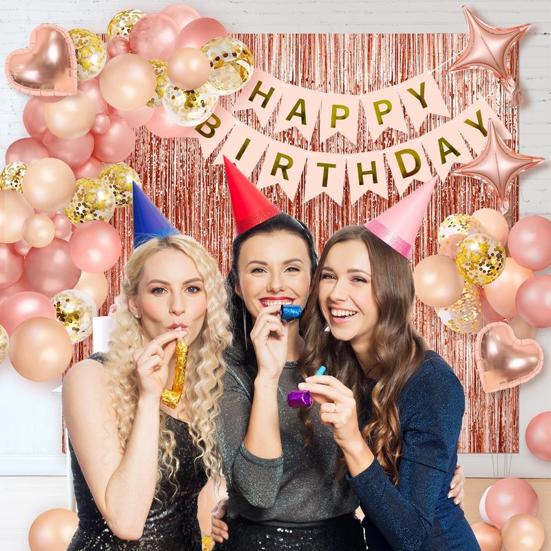- Rose Gold Birthday Decoration Set: Rose Gold Foil Tassel Curtains*2, 32-inch Digital Foil Balloons*2 (Warm Tips: 1-9 years old only has 1 32-inch balloon), Happy Birthday Banner*1, 12-inch Confetti Balloons*12, 10-inch Balloons (Rose Gold*12, Vintage Colors*12) 18-inch Rose Gold Heart Foil Balloons*2, 10-inch Star Foil Balloons*2, 5-Star Tassels Garland*1, Hanging Swirl*6, Cake Topper*1, Balloon Arch Chain*1, 100pcs Balloon Sticky Tape*1 roll, 24-inch Rose Gold Crown*1, Balloon Ribbon*1 roll,
