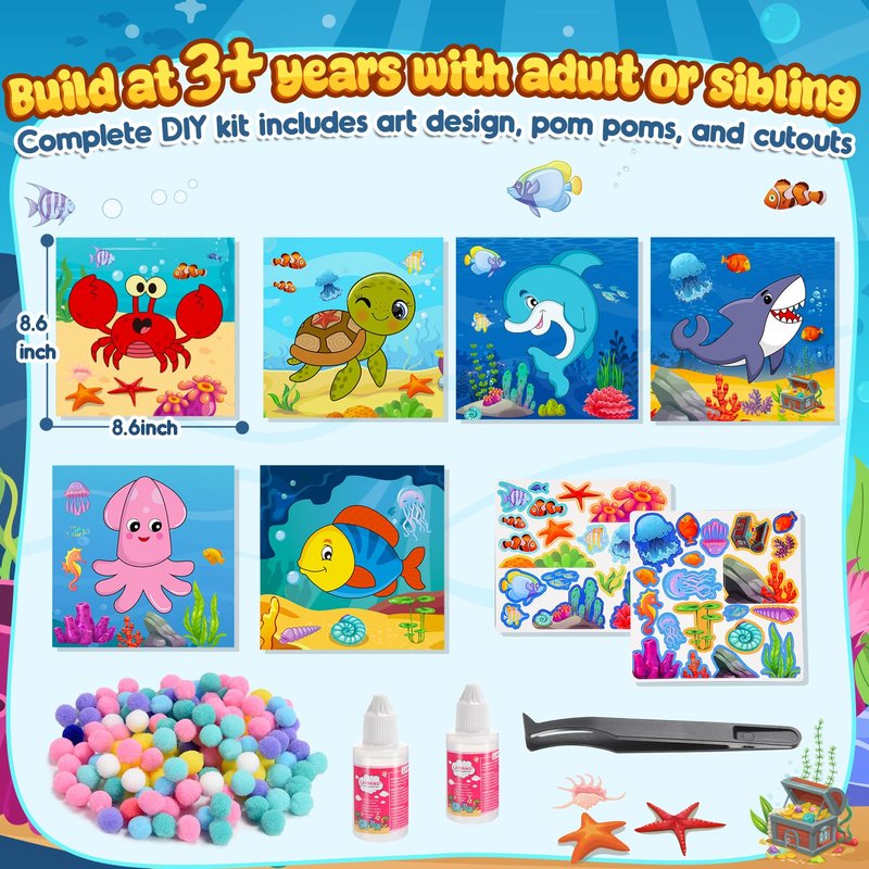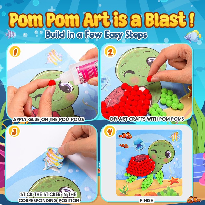 Girls Gifts Pom Pom Crafts 6PCS 7.9-Inch, Pom Pom Art Kit & Crafts for Kids Ages 2-4 4-8 6-8, Toddler Crafts Kits Art Projects, DIY School Supplies Kit, Birthday Christmas Gifts (Ocean Animal Set)