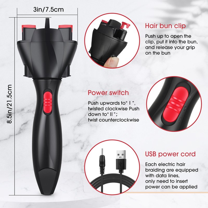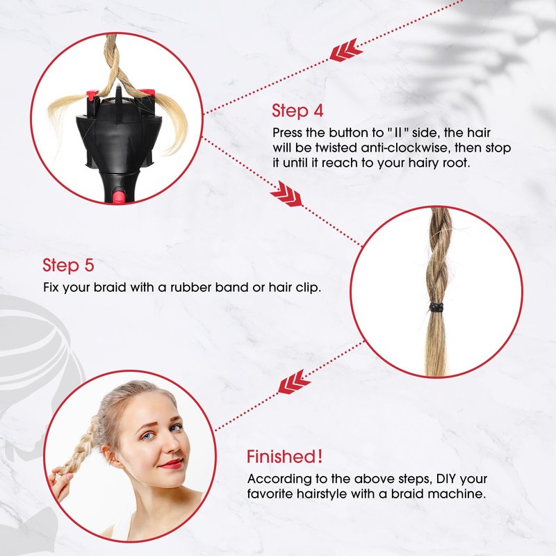 - Simple Steps: first, pick out two strands of hair into the top of the hair braider, release the clip button to hold the hair and then, turn on the switch in the middle of the hair braider, the braid began to start rotating the braid until the hair is twisted to the root of the hair, turn off the switch to remove the braider and finally, use the leather band or bobby pins will be braided and tied up; Finish braiding