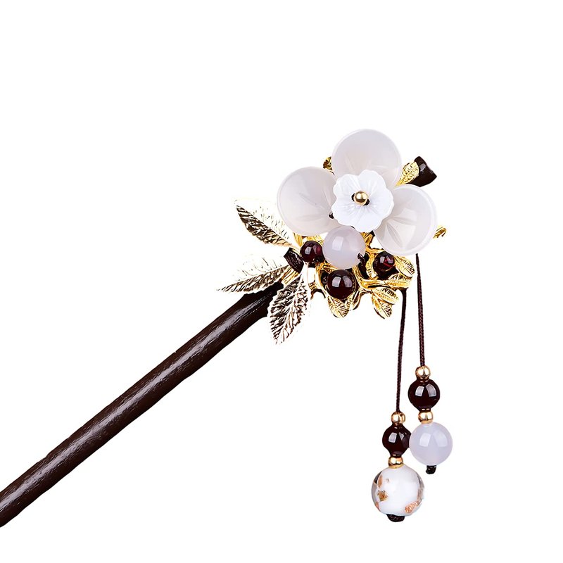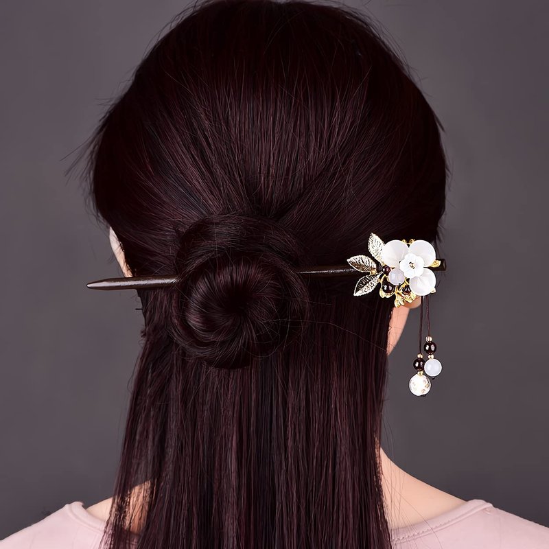 GK-O Japanese White Flower Tassel Wooden Hairpin Hair Stick Kimono Jewelry