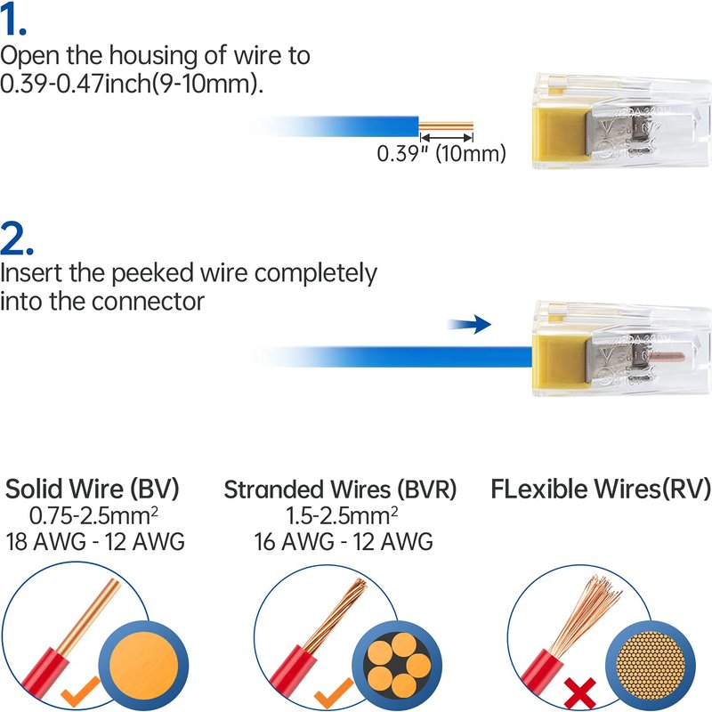 - Instead of traditional electrical tape and electrical butt connectors twist type, it is easy and fast push-in wire installation, that requires no tools, can be fitted in seconds to stripped cables.