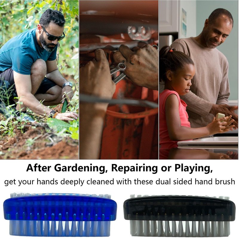 - You will get 2 of these two-sided nail brush in one pack, black and blue, both with white nylon bristles, you can place these hand brush at anywhere like your garage, garden shed, kitchen and laundry room for your convenience