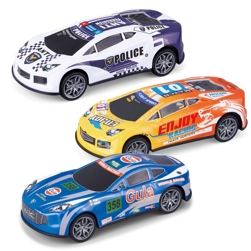 - Pull and go: 7-inch friction powered car with exquisite supercar exterior design, 2 sports cars and 1 police car