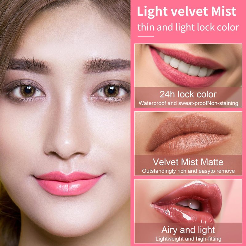 - LONG LASTING NON STICKING: 10 Colour Velvet Liquid Lipstick Set, the most popular colour in full size lip gloss. Glamorous matte, long-lasting and waterproof, non-sticky and colourfast.This is a non-fading lipstick that stays on all day when applied and left to dry, and won't come off when you drink or eat.