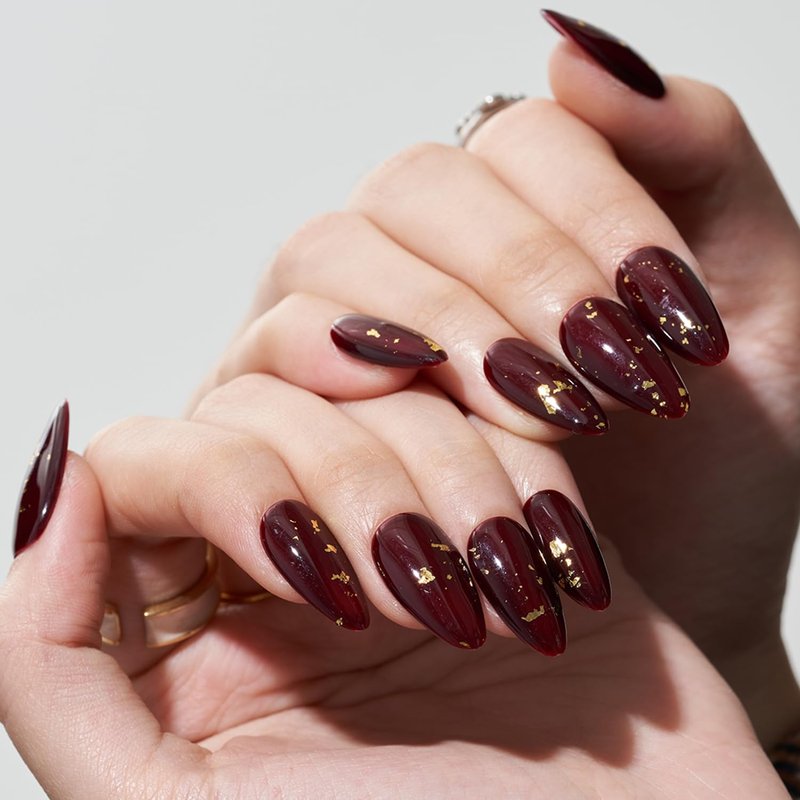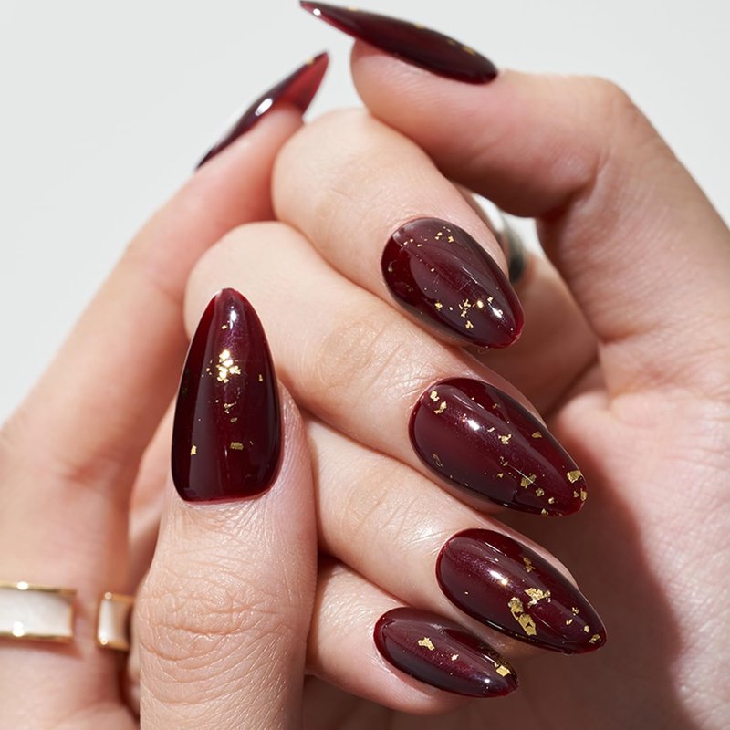 GLAMERMAID Burgundy Press on Nails Medium Almond- Handmade Jelly Gel Gold Foil Flakes Fake Nails Short, Deep Dark Red Stiletto Stick Glue on Nails Set, Glossy Reusable Acrylic False Nail Kit for Women