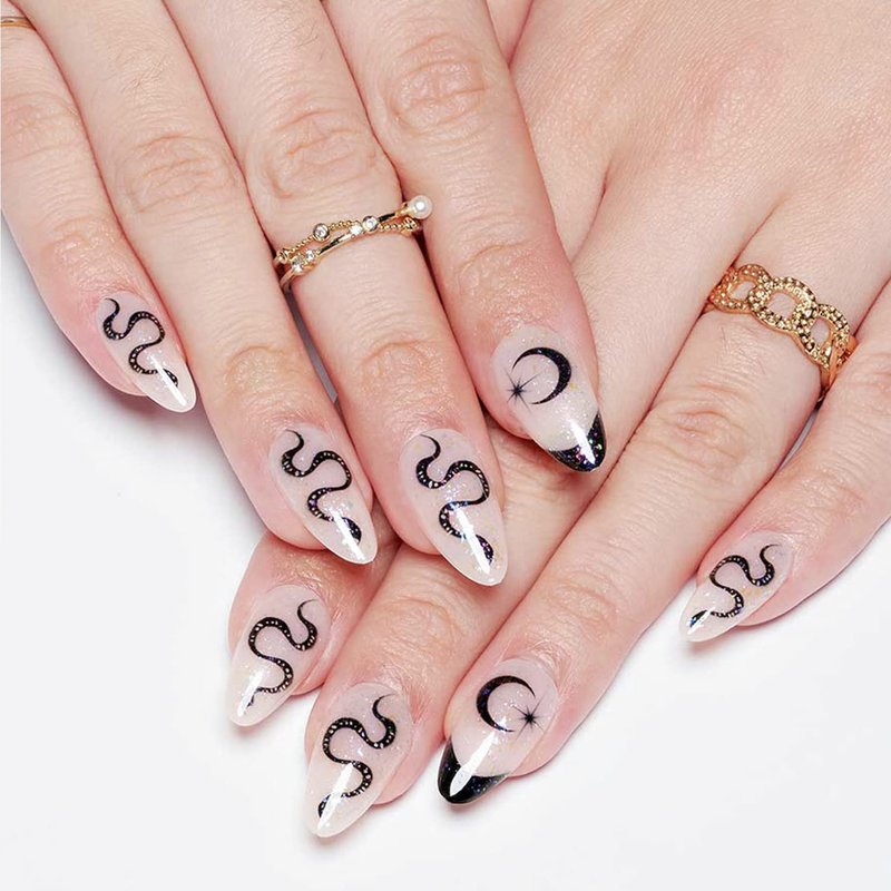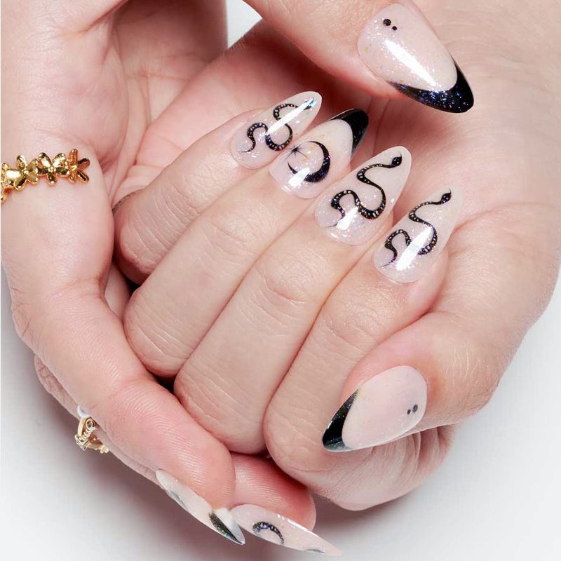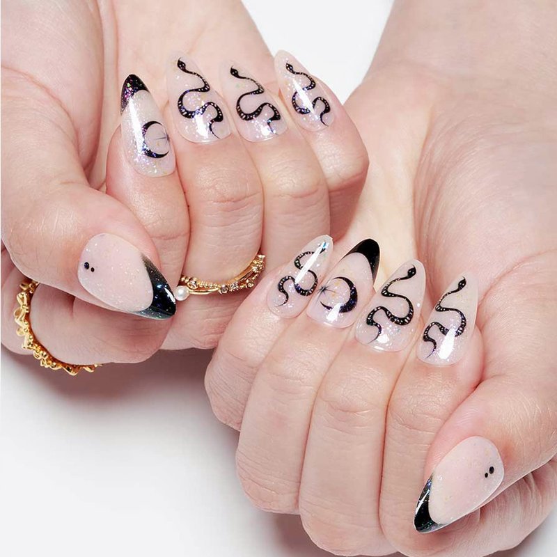 GLAMERMAID Nude White Press on Nails Medium Black French Tip, Gothic Short Fake Nails Almond, Acrylic False Nail Kits with Glitter Snake Design, Stick Glue on Nails Sets, Round Oval Nails for Women