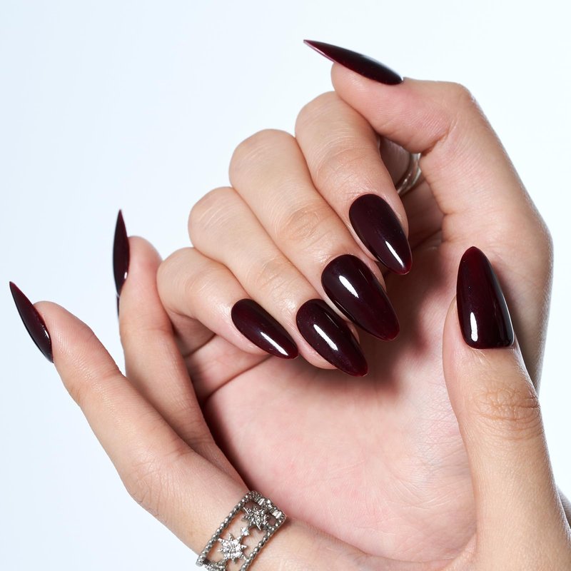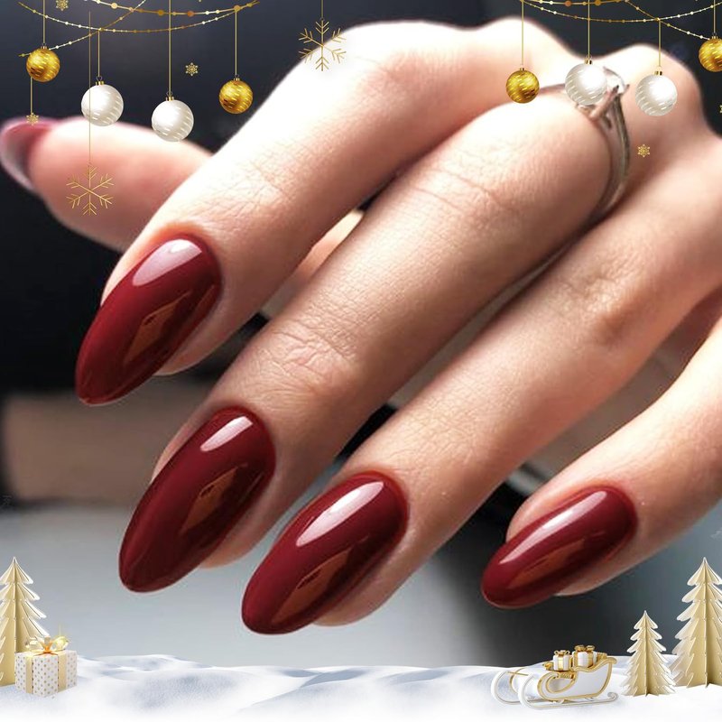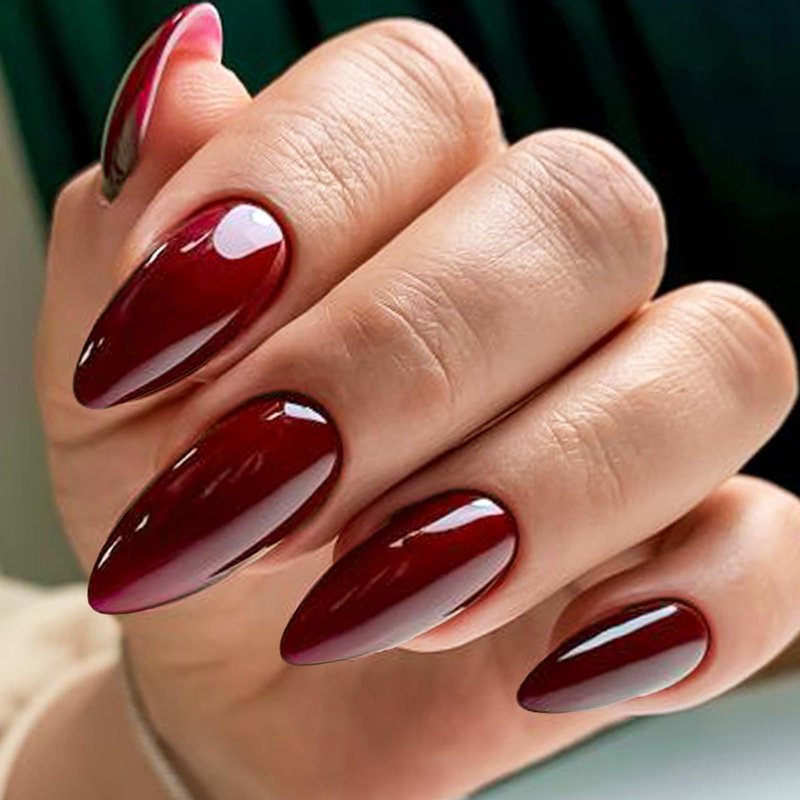 GLAMERMAID Press on Nail Medium Almond, Christmas Handmade Gothic Burgundy Jelly Gel Glue on Nail, 24Pcs Glossy Short Stiletto Reusable UV Finish Fake Nail Acrylic False Nails Manicure Kits for Women