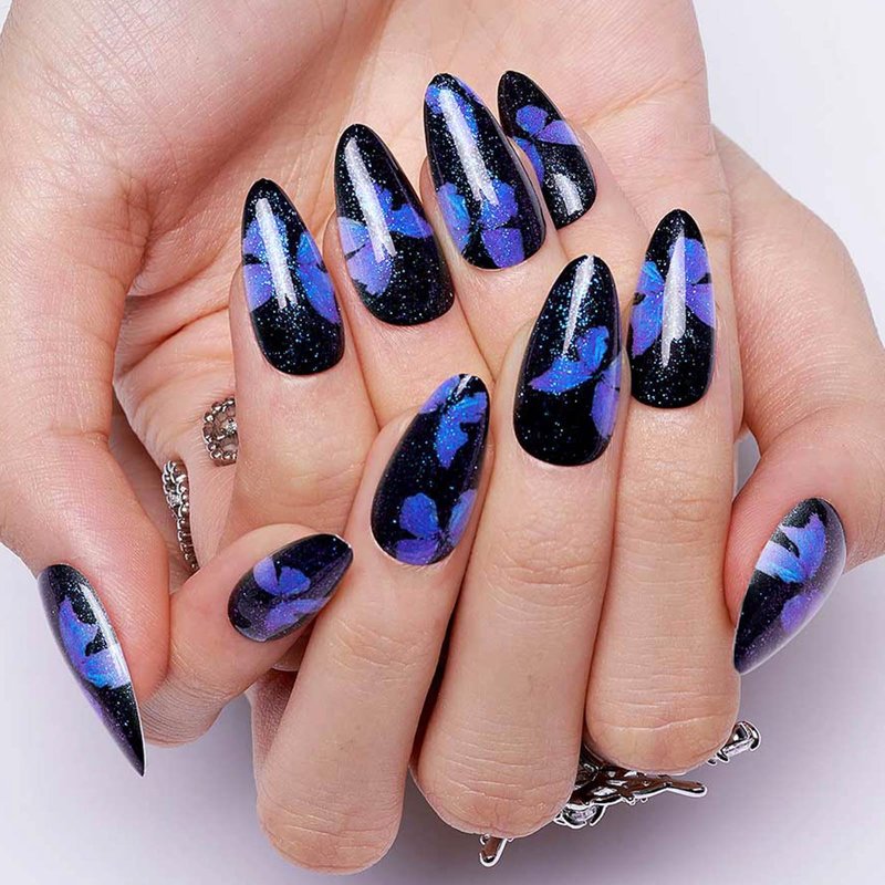 GLAMERMAID Press on Nails Almond,Black Gel False Nails with Butterfly Design,24 PCS Glue on Nails,Reusable Acrylic Stick on Nails Tips Manicure Set for Women,Night Butterfly