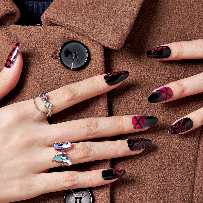 GLAMERMAID Press on Nails Almond,Gothic Black Gel False Nails with Design,24 PCS Glue on Nails,Reusable Acrylic Stick on Nails Tips Manicure Set for Women,Night Family