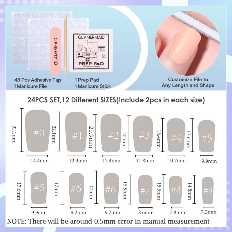 - What you get:24 pcs fake nails with design in 12 different sizes, 48 pcs adhesive tabs, prep pad, mini file, cuticle stick. No matter the size or width of your nails, you can choose the most suitable false nails for yourself. False nails can be customized DIY trim into any length and shape you like, is great for women girls