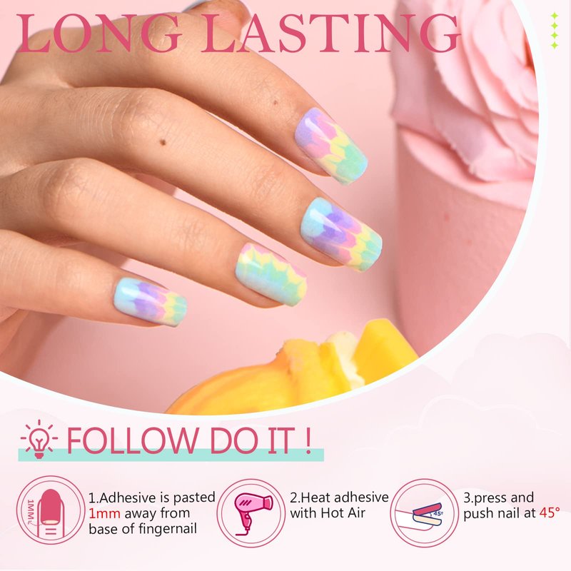 GLAMERMAID Tie Dye Press on Nails Medium Square, Ombre Green Pink Purple Spring Fake Nails Short, Summer Macaron Color Glue on Nails for Women Gift, Glossy Gel False Nail Kits Acrylic Stick on Nails