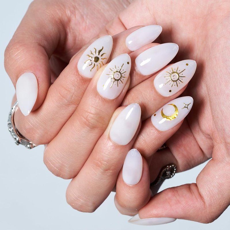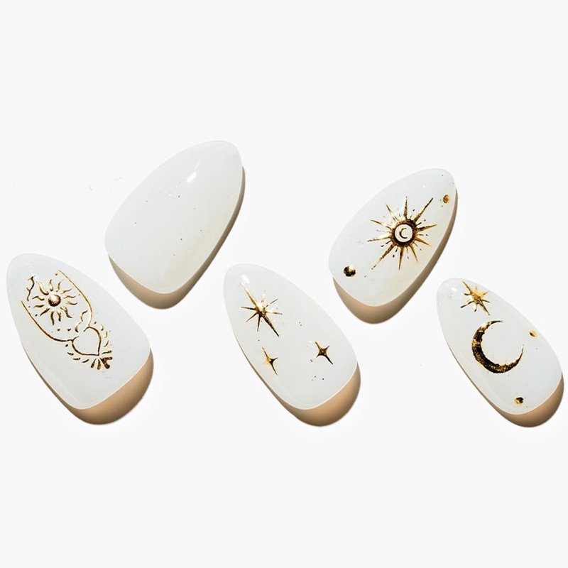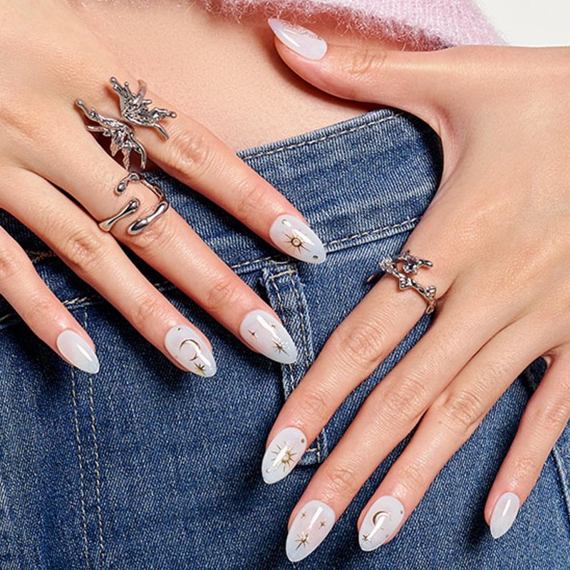 GLAMERMAID White Press on Nails Short Almond, 3D Gothic Handmade Stick Glue on Nails with Golden Star Blossom Design, Medium Oval Reusable Fake Nails Acrylic False Nails Manicure Kits for Women Gift