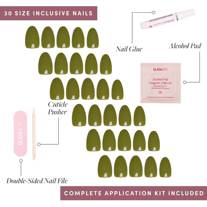 Glamnetic Press On Nails - Moss Green | Opaque Earthy Green Short Oval False Nails, Reusable Stick On Fake Nails with Glue | Salon Quality | 15 Sizes - 30 Nail Kit